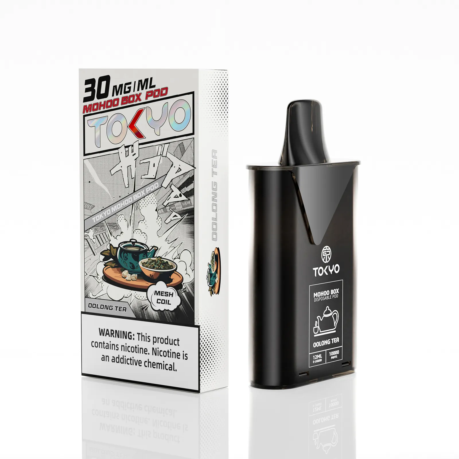 東京魔盒電子煙煙彈採用植物甘油與丙二醇基底,搭配高純度尼古丁鹽,容量 12mL、尼古丁強度 30mg/mL(3%),搭載 1.0Ω 鋼網棉霧化芯,設計為一次性 pod,約 10,000 口吸引力持久。