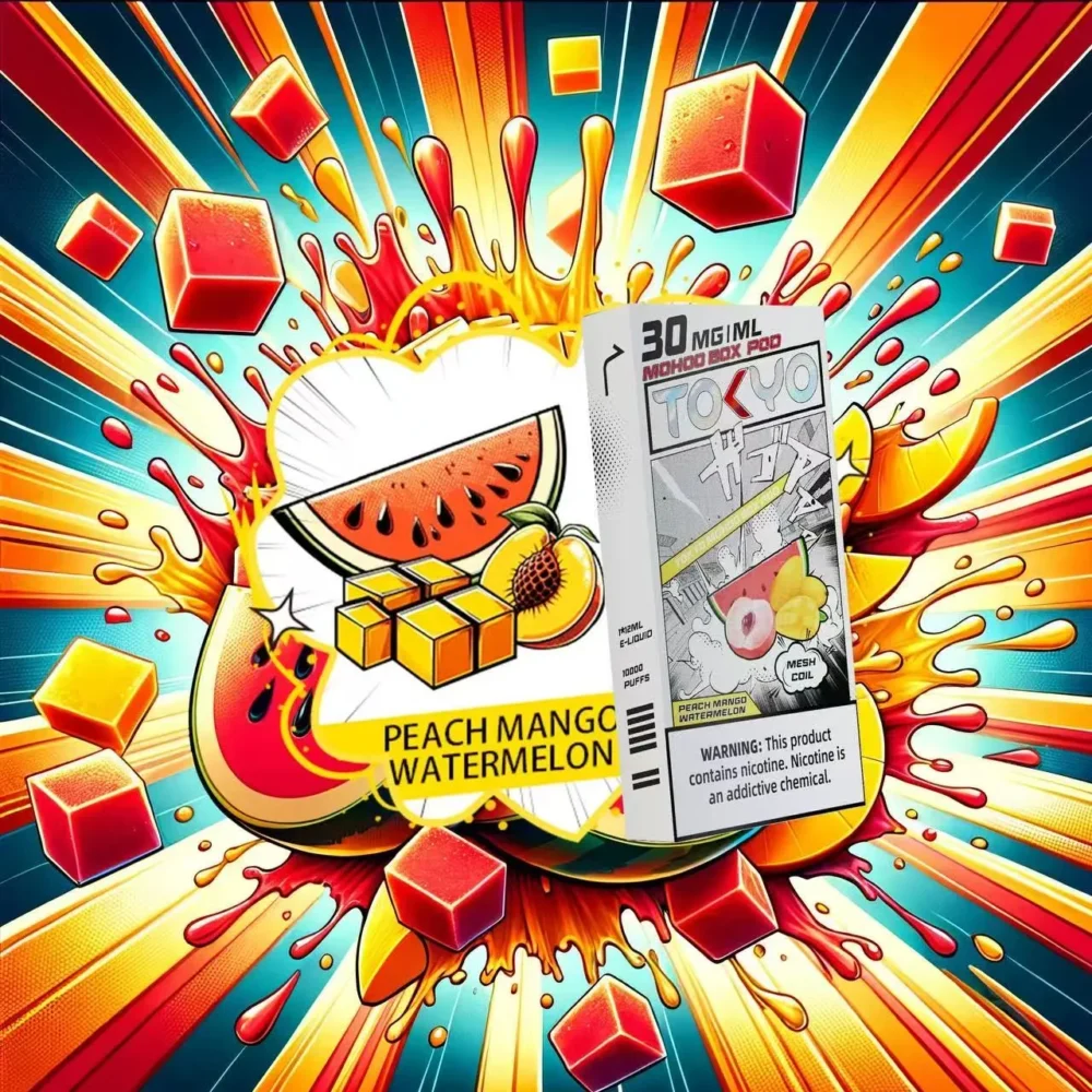西瓜蜜桃芒果口味東京魔盒電子煙彈,融合西瓜清新、蜜桃甜潤與芒果香濃,帶來層次豐富的夏日果香體驗。